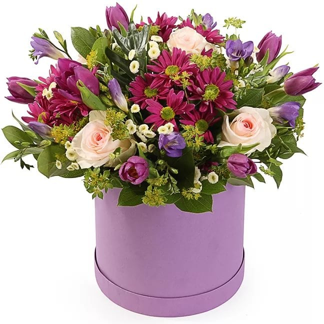 5 роз, 3 хризантемы, 7 тюльпанов, зелень, оазис, коробка, 7 роз, 4 хризантемы, 8 тюльпанов, зелень, оазис, коробка,